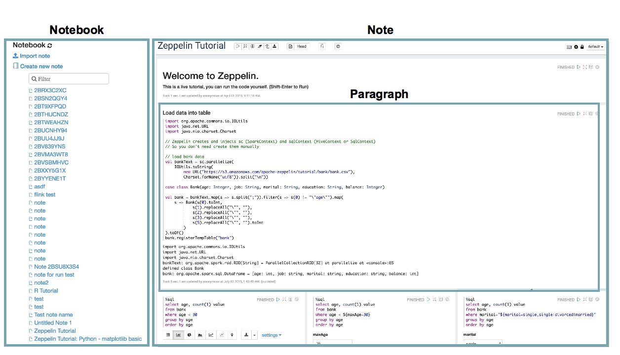 $ZEPPELIN_HOME/notebook文件夹中。 - Paragraph:每一个Note 中包含多个Paragraph,每一个Paragraph就是一个代码段落,每个Paragraph 由code段和result 段构成。Paragraph是一个可执行单元,它等同于一个Job。