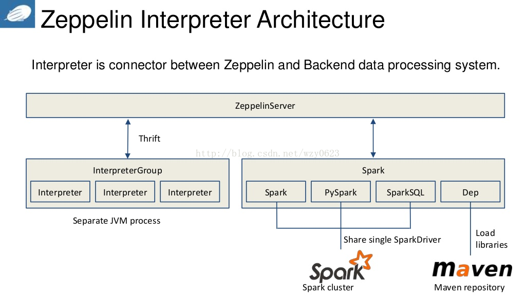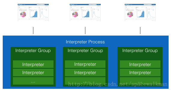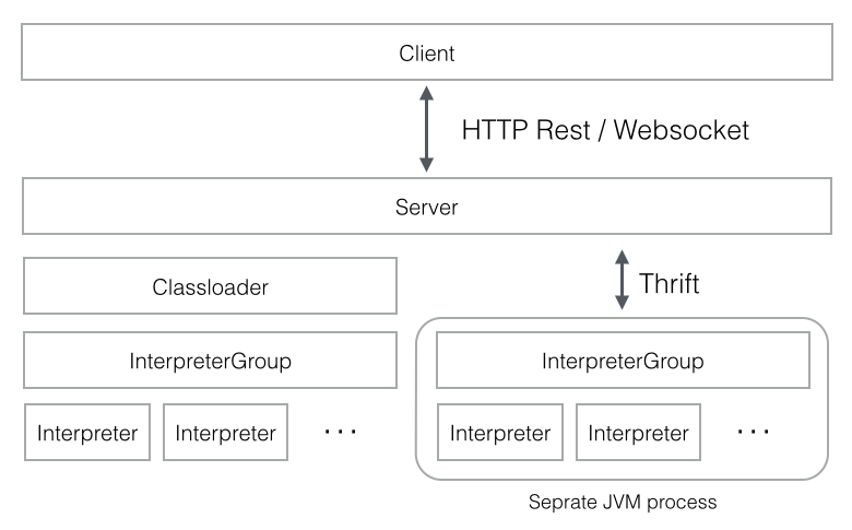 - Remote Interpreter:运行在一个单独的进程里,通过Thrift接口与Zeppelin Server主进程通信,其本质就是用一个新的进程来运行一个Local Interpreter(即ClassloaderInterpreter)。