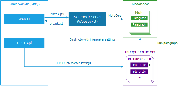 Notebook Server:用于建立并维护前端网页与后端服务器之间的Websocket连接;它其实是一个job listener,接收并处理前端网页发来的Note执行请求,在后端生成并执行相应的job,并将job执行的状态信息广播到所有的前端页面。