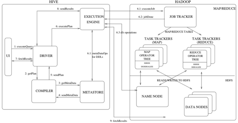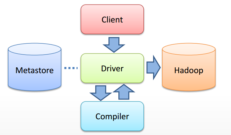 - Driver 结合编译器(COMPILER)和元数据库(METASTORE),对用户查询进行编译解析;